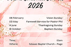 March 26th 2026When? Sunday, 3rd May @ 10am Where? Mosaic Baptist Church - Page (18 Dallachy Street) Since May 2022, Phil and Karen have faithfully served our church community with wisdom, care, and steadyRead moreEpic Youth - Term 1 2026