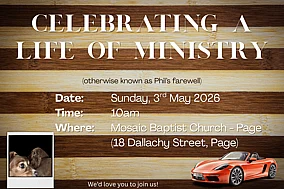 April 24th 2026If you are a young person in years 6 - 10 at school we would love you to come along. When: Friday nights, 7pm - 9pm (1st May - 26th June) Where: Most nights are at Mosaic Page (18 Dallachy StreetRead morePastor Phil Waugh's Farewell Service